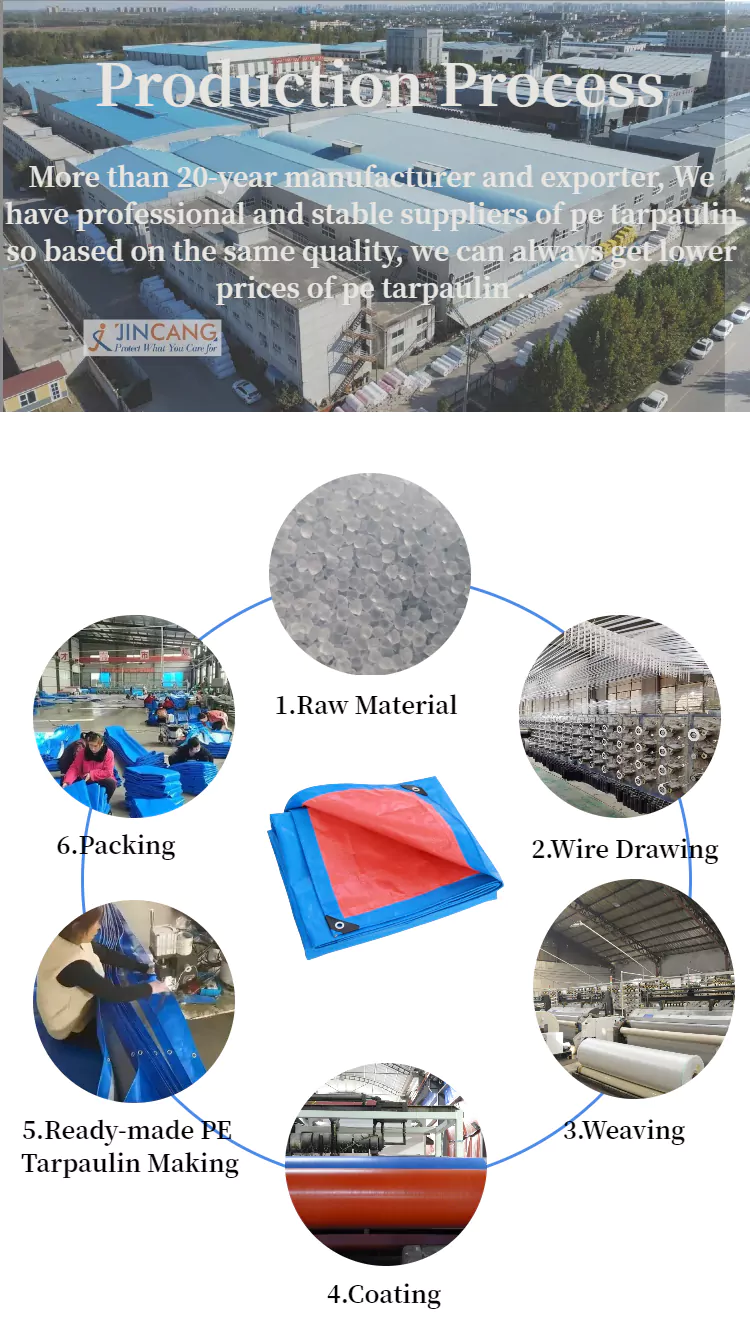 Jincang は、中国のプロの PE ターポリン ロール メーカーの 1 つです。110 GSM ストリップ PE ターポリン ロールは、耐久性と視認性を兼ね備え、ポリエチレンの防水特性と視認性の高いカラー ストライプを組み合わせています。屋外保護、商品のカバー、建設現場、農業目的、および一時的な避難所に広く使用されています。